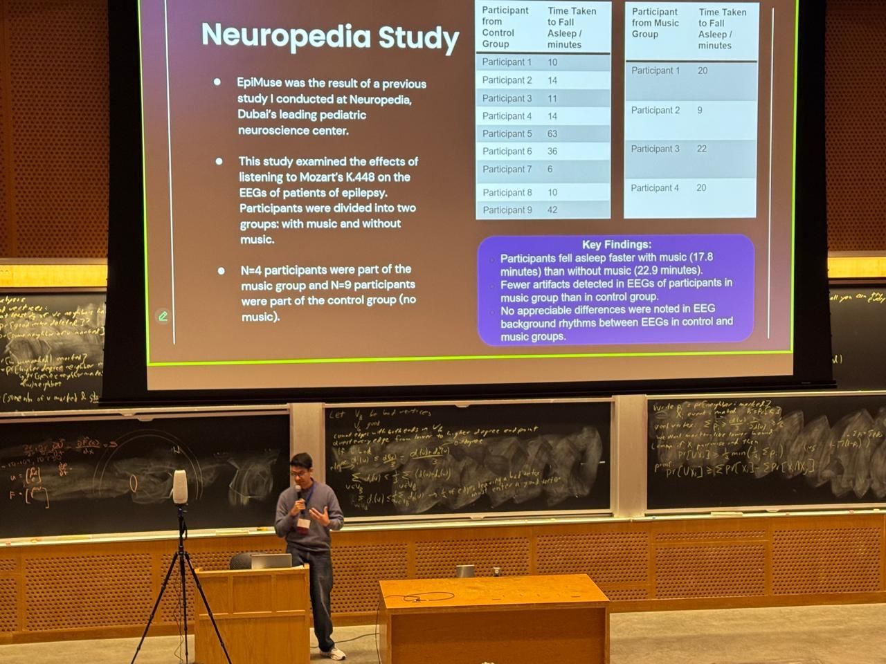 Building on a study I conducted at Neuropedia UAE to investigate the effects of Mozart's music on the EEGs of epileptic patients, I built EpiMuse: a webapp that provides personalized music therapy to epileptic patients using the Muse 2 Headset. My paper was accepted to the prestigious MIT Undergraduate Research Technology Conference (URTC) where I had the privilege of presenting EpiMuse.